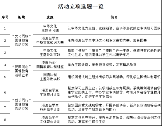 请各学院选定“文化同根”“爱国同心”“成长同行”三类可申报活动中的可选活动进行选择,设计活动方案,完善活动流程。活动立项后将在活动开展阶段进行。