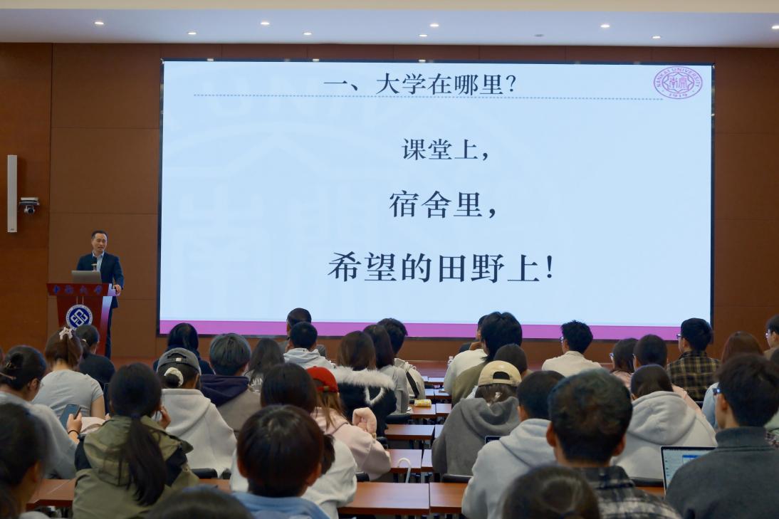 吴晓林教授结合自身在中南大学求学、南开大学从教以及海外访学的经历,从“大学的本质”“社会实践的意义”“读书与调查的方法”“思维培养与家国情怀”四个维度展开深入阐述。他指出,大学不仅是获取专业知识的殿堂,更是培养社会实践精神、提升综合素质的关键阶段。吴教授引用毛泽东主席“没有调查就没有发言权”的著名论断,强调反对本本主义、注重实地调研的重要性。作为大学生必须深入社会实践,通过调查研究获取第一手资料,将理论知识与实践相结合,才能更好地服务社会。