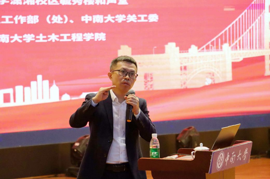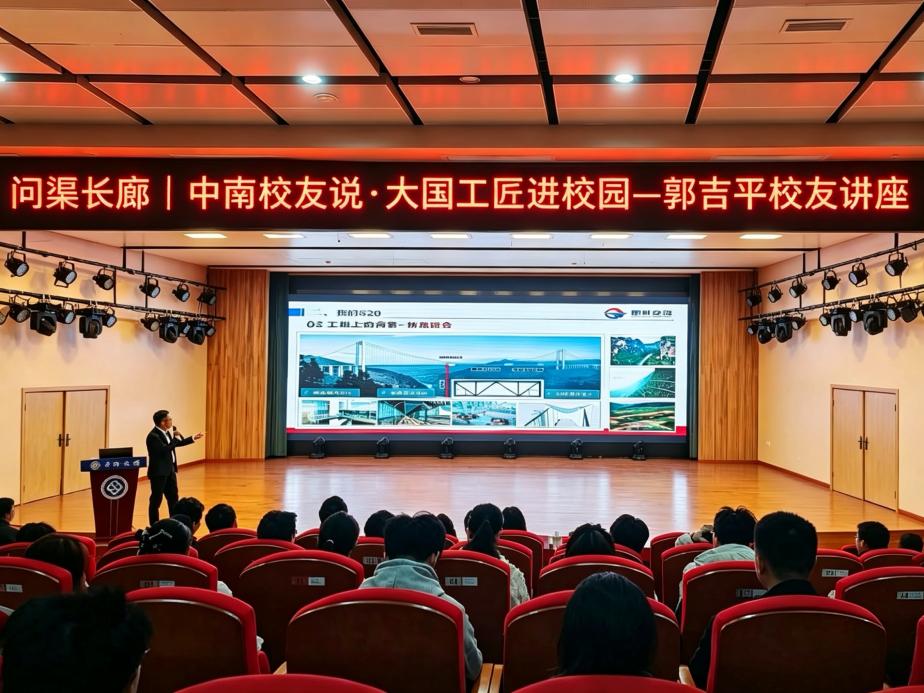 4月18日,由中南大学学生工作部(处)、关心下一代工作委员会主办,土木工程学院承办的以“大国工匠进校园”为主题的问渠长廊·中南校友说活动在毓秀楼和声堂成功举办。我校2000级杰出校友、贵州交投经济与技术研发有限公司研究员、全国劳动模范、全国五一劳动奖章获得者、2025年“大国工匠年度人物”郭吉平担任主讲嘉宾,与师生们一同回望从峡谷到云端的建桥征程,共话土木青年的使命与担当。中南大学学工部副部长宋晓东、校关工委副主任李登伶、天心校区关工委常务副主任胡亚军、土木工程学院副院长乔世范、党委副书记纪晓飞出席。