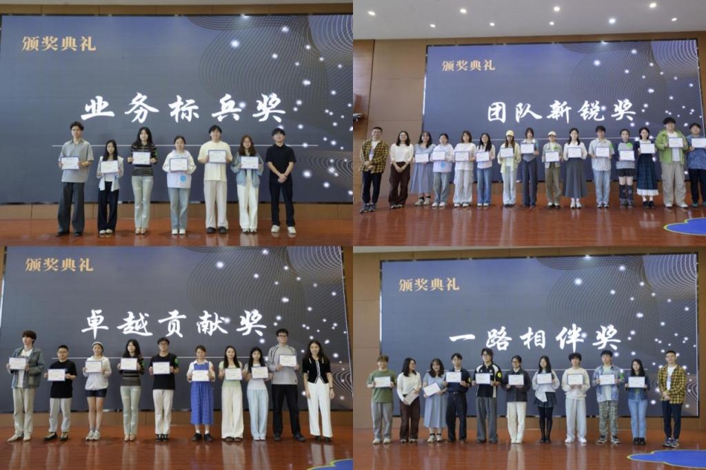 表彰环节严肃而温馨。现场依次颁发卓越贡献奖、业务标兵奖、一路相伴奖、团队新锐奖,表彰在岗位上勤勉尽责、表现突出的骨干成员与新晋力量,颁奖嘉宾为获奖同学颁发奖状与聘书,鼓励大家坚守初心、再创佳绩。