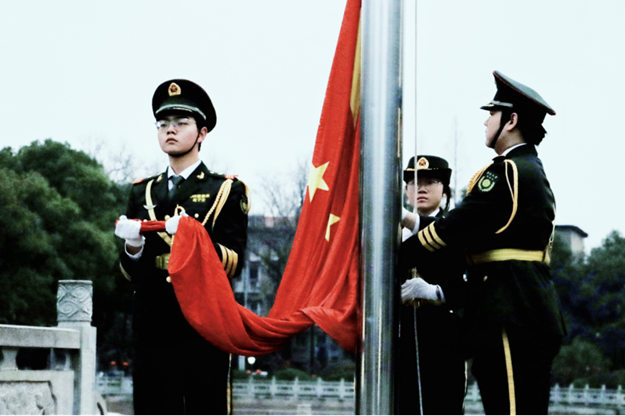 6:40,升旗仪式正式启动,中南大学国旗班队员护送五星红旗缓缓入场,步伐铿锵、身姿挺拔,赢得了现场师生的一致敬意。当《义勇军进行曲》奏响,五星红旗冉冉升起的那一刻,商学院全体参与师生自觉肃立,行注目礼,高声齐唱国歌,歌声嘹亮、情感真挚,每一句歌词都传递着对祖国的崇敬与热爱,每一个眼神都饱含着奋进的决心。大家目光紧紧追随飘扬的国旗,心中满是自豪与使命感,在庄严的氛围中深刻体会到作为新时代青年和教育工作者的责任与担当。