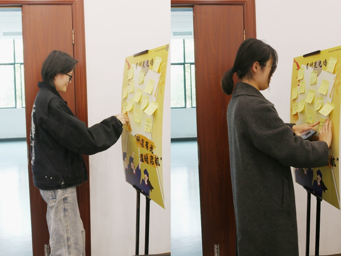 活动的尾声,邀请到场的考研学子低头执笔,写下自己的目标院校、励志话语,或只是一句简单的“我能行”。一张张彩色的便签,逐渐贴满展板,宛如一片发光的星图。“一研为定”、“此战成硕”、“不负来时路”……每一笔,都是对自己许下的承诺;每一张,都是照亮彼此的光。