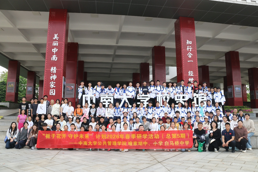 2026年4月24日,在中南大学杏林校区、潇湘校区、麓南校区,中南大学公共管理学院与宁乡市喻家坳中学、喻家坳小学、白马桥初级中学联合开展“栀子花开 守护未来”计划2026年春季研学活动(总第5期研学)。白马桥初级中学党支部副书记黄跃明,喻家坳小学副校长、教导主任李强,公管院本科生辅导员梁慧,喻家坳中学、小学和白马桥中学师生共108人,公管院大学生志愿者20余人参与活动。