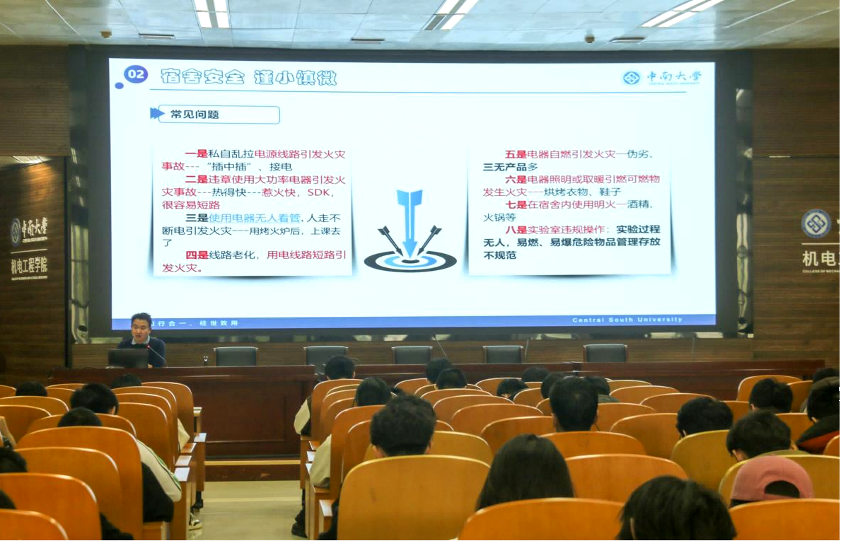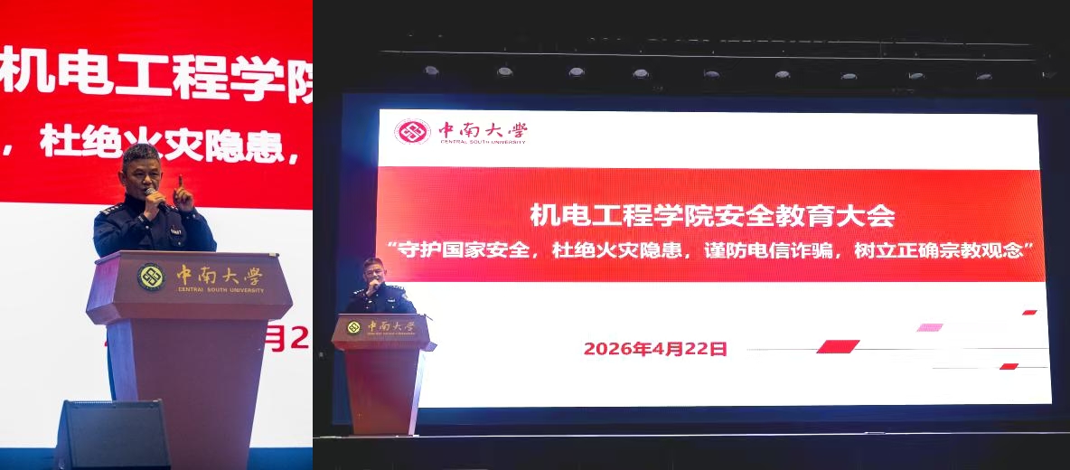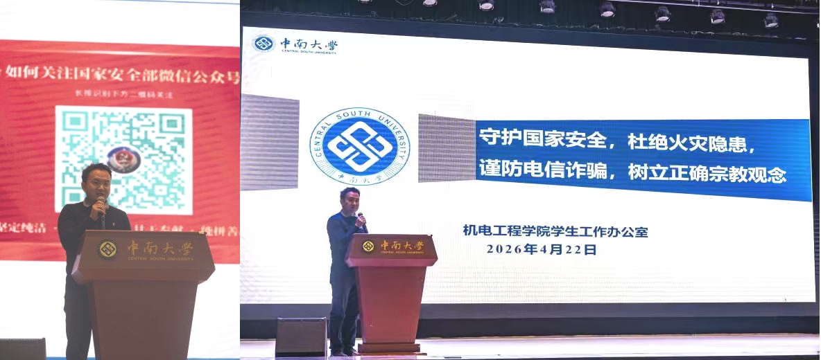 为进一步强化学生安全防范意识,筑牢校园安全防线,4月22日下午,机电工程学院分别在麓南校区礼堂、中铝科技大楼B214报告厅同步召开学生安全教育大会。本科各年级辅导员、1500余名学生参会。