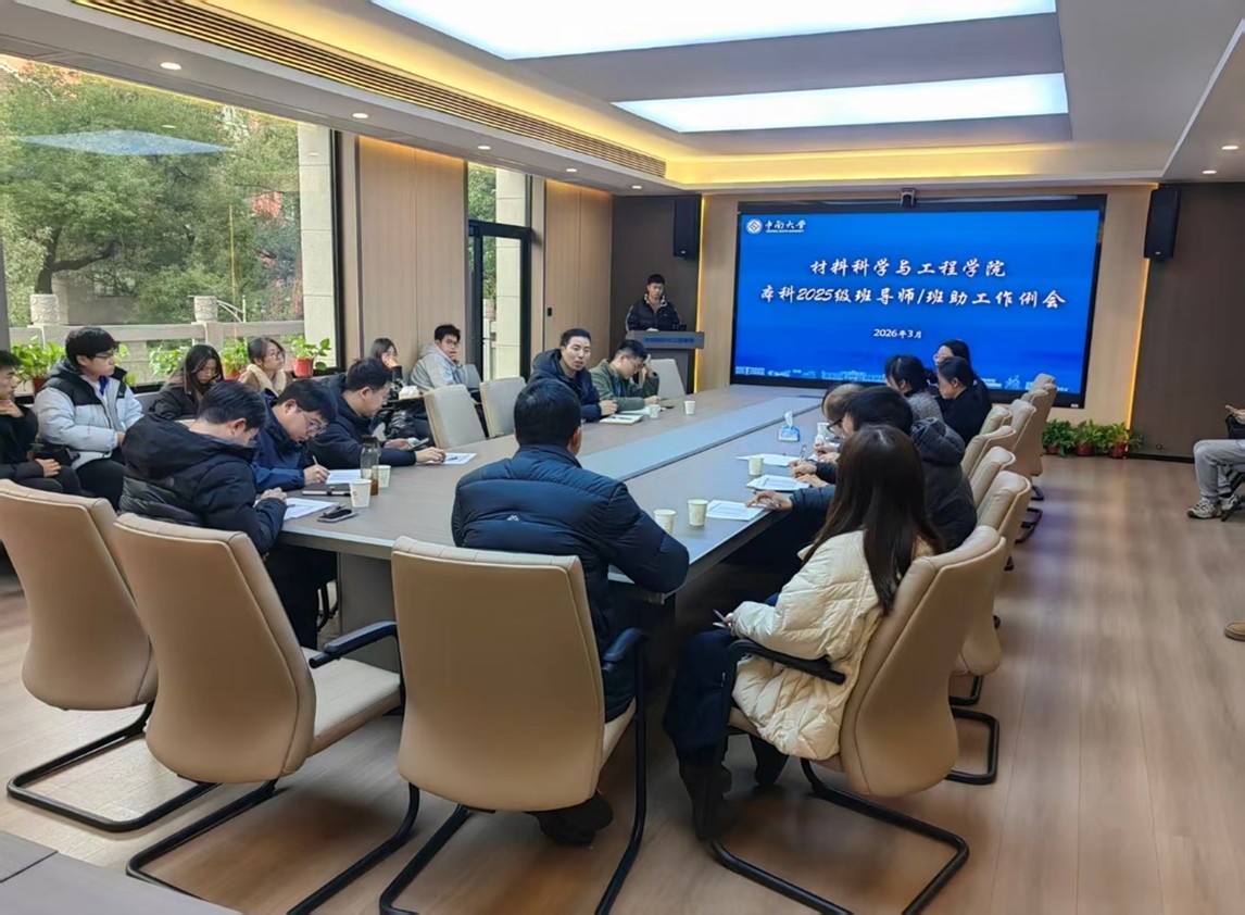 为落实学工部《关于做好2026年春季开学有关工作的通知》,加强班导师交流联系,促进年级班级建设发展,3月5日下午,材料学院2025级班导师及班导师助理工作会在特冶楼229会议室举行。学院学工办主任蔡圳阳、业务办主任张红媛、2025级辅导员张彦隆、刘成骏出席会议,2025级全体班导师及班导师助理参加会议。