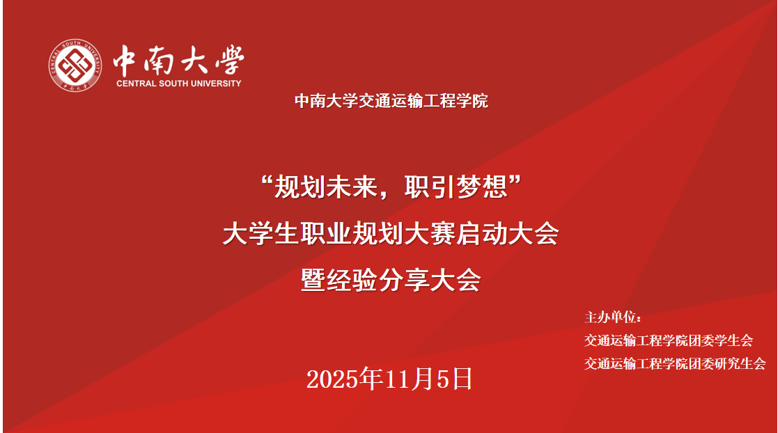 11月5日,中南大学交通运输工程学院“规划未来,职引梦想”第三届大学生职业规划大赛启动大会暨经验分享会于线上召开。本次活动由中南大学交通运输工程学院团委学生会与团委研究生会联合主办。