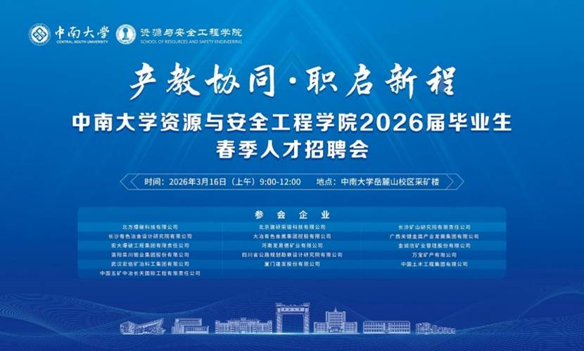 为深化产教融合、促进学生高质量充分就业,3月16日上午,资源与安全工程学院在采矿楼举行2026届春季人才招聘会暨校企合作人才培养座谈会。活动邀请宏大爆破工程集团有限责任公司、金诚信矿业管理股份有限公司、中国五矿中冶长天国际工程有限责任公司、北方爆破科技有限公司等16家用人单位现场提供近400个就业岗位。