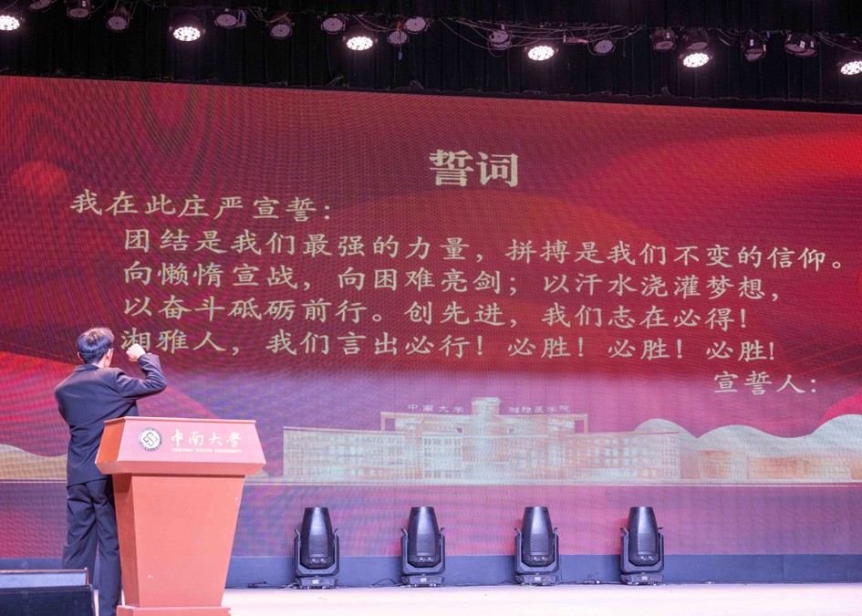 2025年10月19日晚,中南大学湘雅医学院2025年新生入校教育暨学风建设动员大会隆重举行。中南大学党委常委、常务副校长陈翔教授,中南大学党委常委、副校长黎志宏教授,湘雅医学院领导班子成员,医院管理处、医学各二级学院及附属医院领导出席大会。大会由中南大学湘雅医学院党委书记朱利勇教授主持。