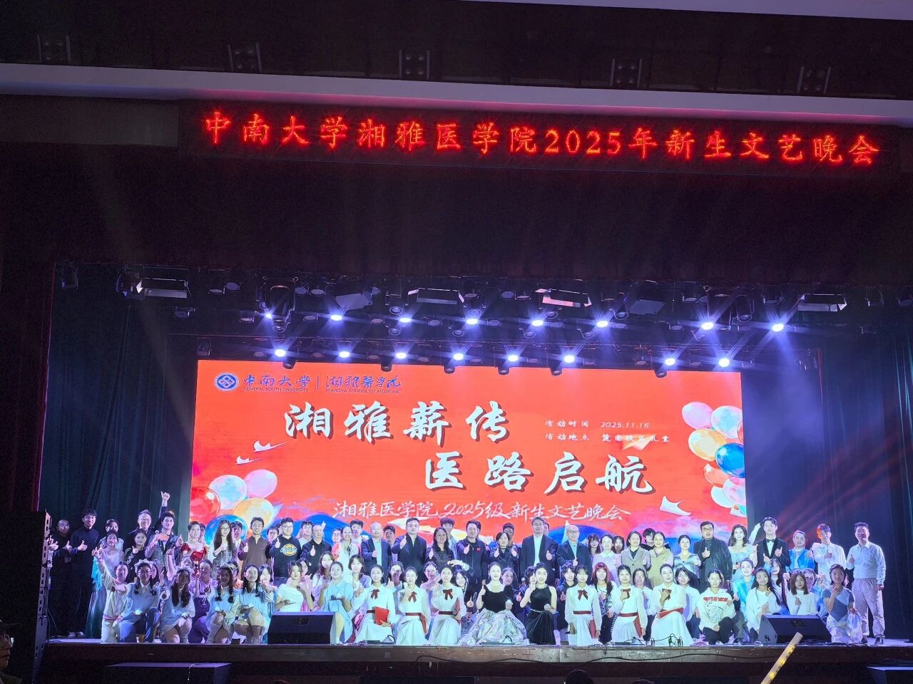 当最后一道光温柔隐去,当经久不息的掌声渐渐平息,空气中弥漫的并非结束的怅惘,而是启程的悸动与蓄势待发的能量。 这场名为“湘雅薪传·医路启航”的晚会,如同在浩瀚青春长河中投下的一颗璀璨星辰,其光芒,将长久地照亮2025级新湘雅人前行的航路,指引他们驶向无限可能的深海。