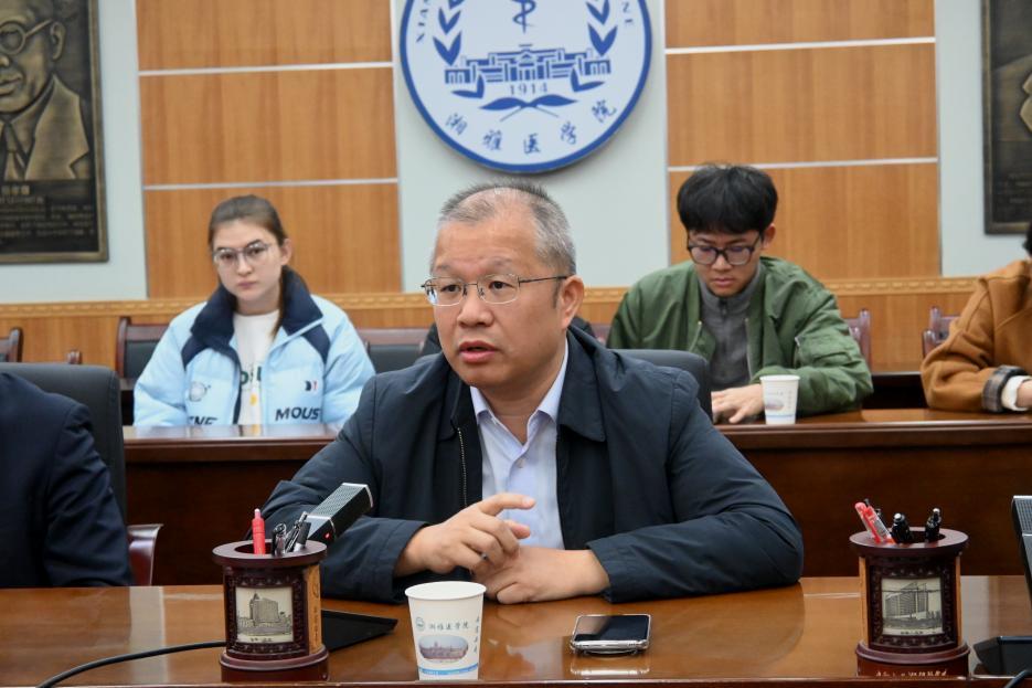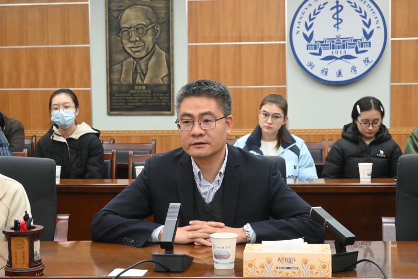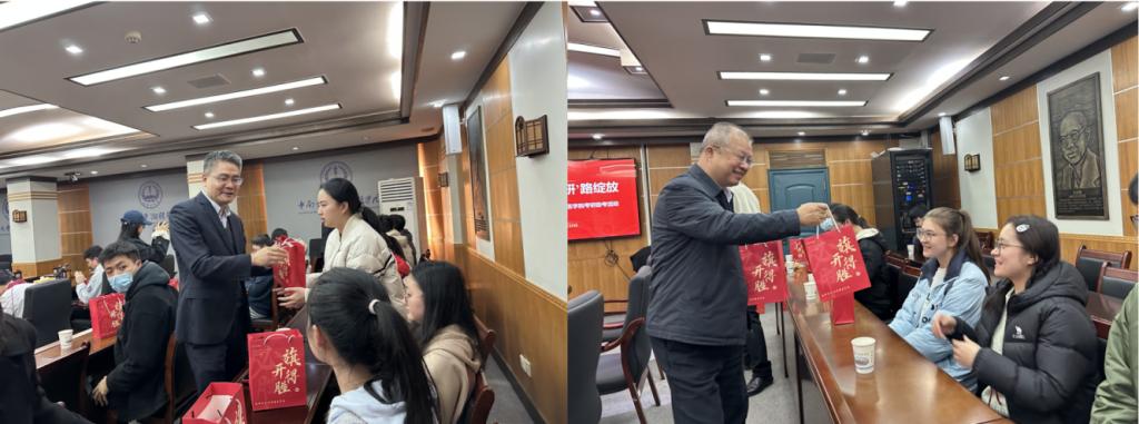 12月10日上午,活动主会场在中南大学杏林校区孝骞楼八楼二会议室温馨开启。湘雅医学院党委书记朱利勇、党委副书记吴世明、学工办主任王丹及临五第三、第四、第五党支部书记携事先准备好的“旗开得胜”礼包为考研学子送去美好的祝愿。朱利勇书记结合自身求学经历,深刻寄语同学们要明确目标、坚定选择,牢记“不为良相,便为良医”的初心,鼓励大家深刻思考考研深造的意义,平衡好考研和实习,科学规划时间;吴世明书记则聚焦当下冲刺策略与心态调整,建议同学们复习应“以重点为纲,不过分追求偏难怪”,并引导大家理性看待考研结果,特别叮嘱同学们务必保重身体,以最佳身心状态迎接考试。随后,湘雅医学院领导代表学院将饱含祝福的加油包亲手送到每一位考研同学代表手中,并与他们进行了简短而温暖的交流互动。
