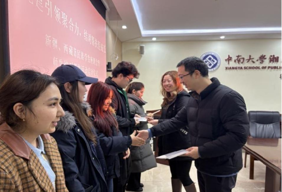 为切实强化民族团结进步教育,铸牢中华民族共同体意识,多途径、多举措关心关爱各族学生,中南大学湘雅公共卫生学院“党建引领聚合力,结对帮扶促成长”新疆、西藏籍民族学生座谈会暨师生结对帮扶活动启动仪式于2025年12月25日上午,在杏林校区湘雅公共卫生学院B203会议室顺利举行。中南大学党委学生工作部副部长姚勇、民族学生事务办公室专职辅导员艾尼瓦尔·艾麦尔、湘雅公共卫生学院党委全体委员及2024级新疆、西藏籍民族学生共同参与。活动由学院党委副书记王超主持。