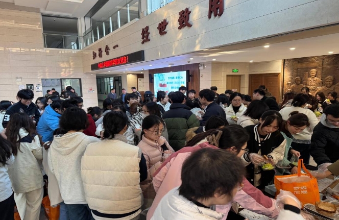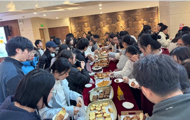 走进药学楼一楼大厅,首先映入眼帘的是电子屏幕上温馨的生日邀请:“邀您与湘雅同庆,共赴一场温暖的生日之约”。屏幕前方,长桌上铺着红色桌布,各色糕点、水果、饮品精心摆放。老师们脱下白大褂,同学们暂别实验室,大家身着各色冬装,围聚在一起。棕色皮质沙发上,四位女生分享着零食与见闻;一旁站立的师生轻松交谈,距离在美食与笑声中消融。