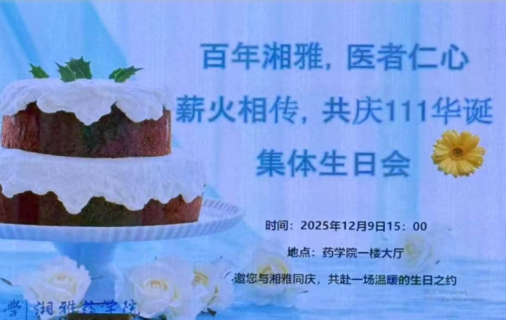 为庆祝湘雅医学办学111周年,2025年12月9日,湘雅药学院精心筹备了集体生日会,师生们齐集药学楼一楼大厅,以简单而真挚的方式共同庆祝这个属于所有湘雅人的特殊日子。