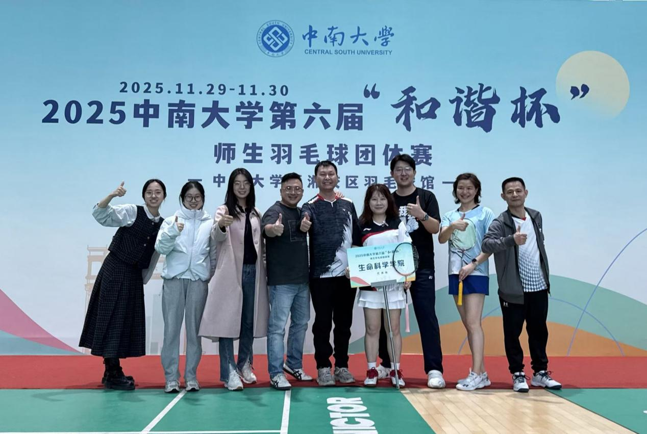 2025年中南大学第六届“和谐杯”师生羽毛球团体赛于11月29日至30日在潇湘校区羽毛球馆顺利举行。本次比赛由中南大学学生工作部(处)主办,吸引了全校多个学院的师生代表队踊跃参与,竞争激烈、精彩纷呈。生命科学学院代表队凭借顽强意志和团队协作,在众多强队中脱颖而出,最终挺进四强,再创历史佳绩,充分展现了学院师生昂扬向上的精神风貌。