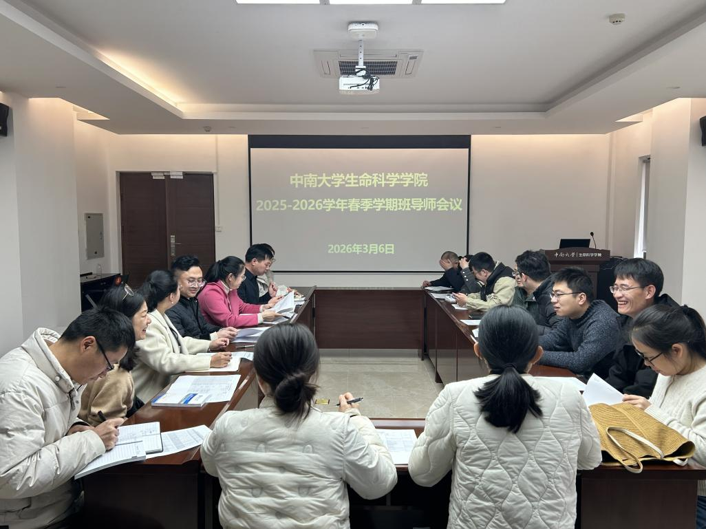 为全面部署新学期学生工作,凝聚育人合力,3月6日下午,生命科学学院在生科院院楼D625会议室召开了2025-2026学年春季学期班导师工作会议。院党委副书记李善妮、本科生各班级班导师、学工办主任李跃辉、辅导员陈梅明和辅导员谢彬参加会议。会议由李善妮副书记主持。