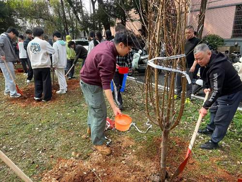 活动现场,同学们分工协作、默契配合。铁锹起落间,湿润的泥土翻涌成诗;扶苗定植时,笔直的枝干对准向上的方向;清水浇灌下,每一寸新土都浸润着青春的热忱。大家或弯腰培土,或提桶穿梭,或为树苗系上专属铭牌,在共同努力下,八株碧桃树苗稳稳扎根,每一片待发的芽苞,都承载着守护绿色的滚烫初心。劳动之余,志愿者们围在树苗旁,分享对于生态环保感悟,让志愿精神在泥土与绿意间悄然传递。