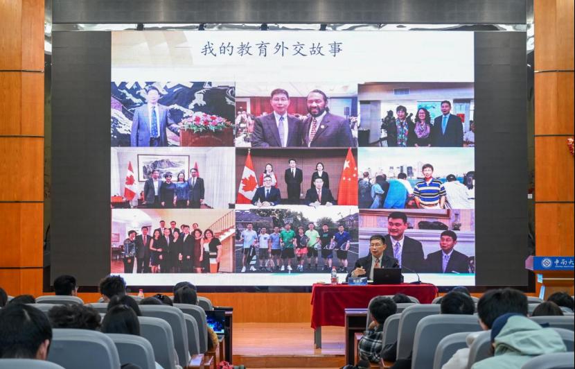 2026年3月25日,由中南大学学生工作部(处)、校团委指导,邓迪国际学院团学会主办的“外交官看世界——中国教育外交及中国学生国际视野的培养”专题讲座在外语楼一楼报告厅顺利举行。活动由张益群参赞担任主讲人,吸引众多师生到场聆听。